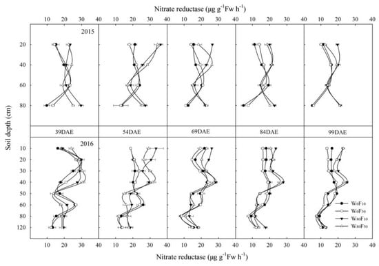 Changes in the nitrate reductase activity (μg g−1FW h−1) in different vertical soil layer (from 0 to 120 cm soil layer) at pre-sowing irrigation (W80) or no pre-sowing irrigation (W0) and basal surface fertilization (F10) or deep (F30) application with the days after emergence (DAE) in 2015 and 2016. Bars indicate SD (n = 3).