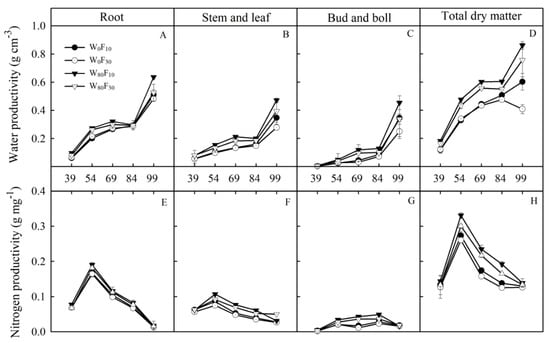 Nitrogen productivity was defined as the total biomass (g plant−1) or the biomass of each plant organ (root, stem and leaf, bud and boll) per unit of applied fertilizer-nitrogen (g plant−1) at different growth stages [30]. In this study, nitrogen productivity was assessed at 39, 54, 69, 84 and 99 DAE.
