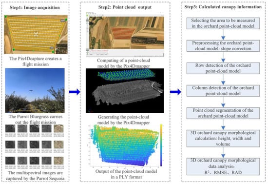 The remote UAV photogrammetry for 3D orchard canopy morphology proposed in this study is suitable for remote evaluation of 3D canopy morphological parameters of modern standard orchards and can be expanded to various types of fruit trees. The point-cloud preprocessing method, rapid row and column detection method, and 3D point-cloud morphological calculation method developed in this study can provide a theoretical basis and technical support for orchard canopy estimation, which is of great significance for the intelligent management and control of modern standard orchards.