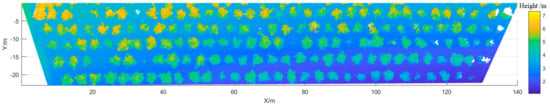Using MATLAB software, the orchard point-cloud data were read, according to the actual measurement area requirements, the boundary point coordinates of the orchard point-cloud model were defined manually, and the point-cloud signals in the area to be computed were screened out accordingly. Next, ground sampling for the point-cloud model was performed for a slope estimation of the ground, followed by a slope precorrection of the model. Then, the probability density estimation along the rows (Y-axis) from the point cloud, the points for row segmentation were determined based on the local peak and valley values and the boundary of each row were identified. Similarly, column segmentation was performed after a probability density estimation in the column direction (X-axis) from the point cloud. As a result, the point-cloud segmentation of each fruit tree in the orchard point-cloud model was accomplished and then stored in two-dimensional cell arrays. Finally, the morphological parameters of each fruit tree in the 3D point-cloud model, including the height, width, and canopy projection area and volume, were calculated, and the accuracy of the information obtained was evaluated and analyzed.