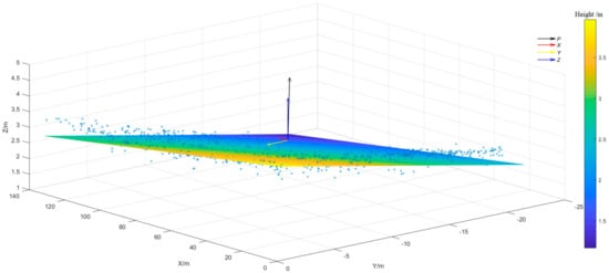 Modern standard orchards are characterized by orderly plant rows and columns, which can meet the operation requirements of agricultural machinery and equipment. However, due to the slopes in orchards, which often affects evaluation, it is necessary to estimate the slope angle and make a correction accordingly. The first step was the point-cloud ground sampling in the measurement area. The point-cloud map was divided into 200 × 6 grids along the X-axis and Y-axis, and then the coordinates of each grid were calculated, including the X-mean, Y-mean, and Z-minimum value of the coordinates. A ground sampling map of the point cloud is shown in Figure 3. The second step was the plane fitting of the ground point cloud to determine the normal vector, P (a, b, and c), of the fitted ground plane and the center point, M (x0, y0, and z0), of the measurement area (Figure 3). The third step was the displacement processing of the point cloud in the measurement area. As shown in Equation (6), using the center point of the measurement area as the origin (0, 0, 0), all points were subjected to a slope-correction by transforming the normal vector, P, of the fitted ground plane to the Z-axis (0, 0, 1). The normal vector, P, was first rotated around the X-axis until the XOZ plane and then around the Y-axis until it reached the Z-axis. Therefore, the calculation formulas for point-cloud coordinate transformation are shown in Equations (7)–(9) below.