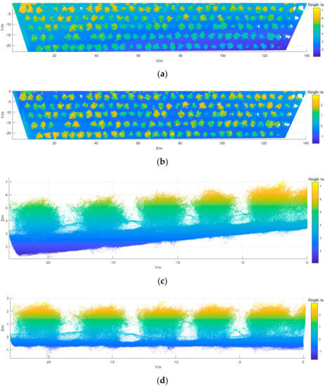 Slope correction of the orchard point-cloud model. (a) Orchard point-cloud model before correction (XOY plane view); (b) Orchard point-cloud model after correction (XOY plane view); (c) Orchard point-cloud model before correction (YOZ plane view); (d) Orchard point-cloud model after correction (YOZ plane view).