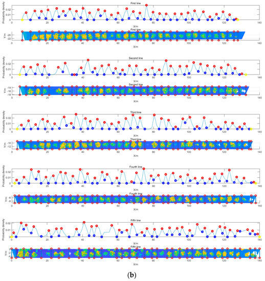 In Figure 5a, the peak, valley, and boundary values of the Y-axis probability density are marked with red, blue, and yellow circles, respectively. The Y-axis boundary and valley points were used for row segmentation. The Y and Ymax parameters corresponding to the Ymin and valley value were sequentially saved to a row segmentation position array, L, which ultimately stored the i+1 row positions (i is the number of rows). According to the boundary values, Xmax and Xmin, of the X-axis coordinates, the coordinates of the corner points in the X and Y axes of each row segment were (Xmin, L (m)), (Xmax, L (m)), (Xmax, L (m + 1)), and (Xmin, L (m + 1)), where the value range of m was from 1 to i. Finally, the point-cloud coordinates of each row segment were saved. The third step was the column segmentation following similar procedures, during which the probability density of the X-axis coordinates of each row segment were sequentially estimated, and then the peak and valley probability density values and their corresponding X values were determined. As shown in Figure 5b, the peak, valley, and boundary values of the X-axis probability density are marked with red, blue, and yellow circles, respectively. The X-axis boundary and valley points were used for column segmentation. The X and Xmax corresponding to the Xmin and valley value were sequentially saved to a row segmentation position array, C [7] (the number of columns in each row might vary), where i was the row number. The coordinates for column segmentation of each row were saved. According to the boundary values, L (m) and L (m+1), of each row, the coordinates of the corner points on the X and Y axes of each column and row segment were (C{m} (n), L (m)), (C{m} (n + 1), L (m)), (C{m} (n + 1), L (m + 1)), and (C{m} (n), L (m + 1)), where m is in the range of 1−i, i is the number of rows, and n is in the range of 1 to size (C{m})−1. Finally, the point-cloud coordinates of each row and column segment were saved.