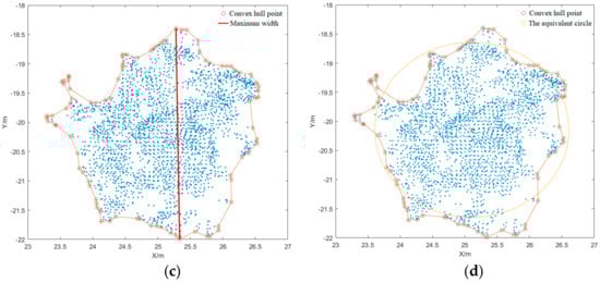 Morphological calculation of the fruit canopy projection on the XOY plane. (a) XOY convex hull boundary; (b) Distance set of the boundary points; (c) Canopy width; (d) Equivalent circle of the canopy projection.