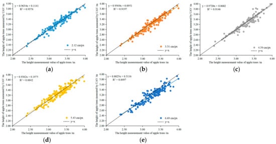 The canopy H, W, and V of all apple trees in the measurement area were calculated using the proposed 3D point-cloud morphological calculation method. The H was the vertical distance from the highest point of the apple tree canopy to the ground. The maximum width of the apple tree was measured many times; the maximum value was selected as the actual W. The actual V was calculated by using the ellipsoidal volume calculation formula based on the maximum circumscribed circumference and height of the tree canopy, which was measured manually. The calculated values and measured values of H, W, and V of all apple trees were compared and analyzed. Figure 8, Figure 9 and Figure 10 present the scatter plots showing the correlations between the values measured manually and estimated by UAV for the canopy height, width, and volume, respectively.