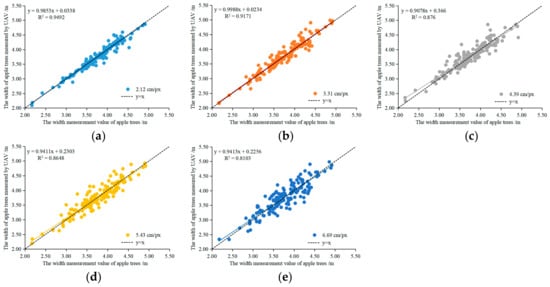 For the canopy W, when using a GSD of 2.13, 3.31, 4.39, 5.43, and 6.69 cm/px, the R2 between the measured value and the UAV-estimated value was 0.9492, 0.9171, 0.8760, 0.8648, and 0.8103, respectively; the RMSE was 0.12, 0.15, 0.18, 0.19, and 0.23 m, respectively; and the RADavg was 2.18%, 2.97%, 3.54%, 3.83%, and 4.92%, respectively. The canopy width of an apple tree is the largest width of the projection area under the top view of the UAV. The measurement accuracy of the apple tree canopy width based on the 3D point-cloud model is similar to the method of extracting the canopy width information of the apple tree based on DTM and DSM [24]. Compared with the method by the Kinect sensor to measure the canopy width, when GSD was 2.13 to 4.39 cm/px, the width measurement accuracy of fruit trees was similar, but with the increase of GSD, the point cloud density of the fruit trees decreases, resulting in the measurement accuracy being lower than the measuring method using the Kinect sensor [25].
