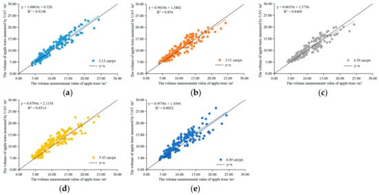 For the canopy V, when using a GSD of 2.13, 3.31, 4.39, 5.43, and 6.69 cm/px, the R2 between the measured value and the UAV-estimated value was 0.9148, 0.8560, 0.8469, 0.8314, and 0.8032, respectively; the RMSE was 1.41, 1.63, 1.64, 1.91, and 2.21 m3, respectively; and the RADavg was 7.90%, 8.28%, 11.90%, 12.61%, and 13.69%, respectively. In this study, the volume of the apple tree canopy was extracted based on the 3D point-cloud model of the orchard, and the measurement accuracy was lower than vehicle lidar [1,9], which was mainly due to the fact that the 3D point-cloud model of the orchard generated by pix4Dmapper could not fully express the morphological information of the lower half of the apple trees, but the 3D point-cloud model of the apple tree canopy could be accurately reconstructed by the vehicle lidar, so the volume measurement accuracy was higher. The canopy shape of apple trees is very complex, and the volume calculation method has a great influence on the results [26]. Generally, the outer surrounding volume is the canopy volume. In this study, the projection area of the canopy in the XOY plane, the height of canopy, and the height of trunk were integrated, and Equations (3–5) were used to estimate the volume of the apple trees, which reduced the influence of canopy noise on the volume calculation and improved the stability of the volume measurement.