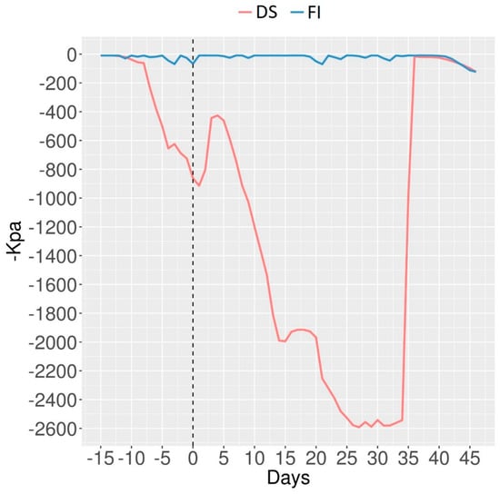 Soil water potential (−kPa) of full irrigation (FI) and drought stress (DS) during irrigation suspension. The male flowering date occurred precisely on 24 June 2016, representing 67 and 61 days after sowing, for both late and early genotypes, respectively, and is represented on day zero.