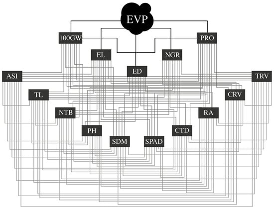 Causal chain graph showing the interrelationship of the main variable expanded popcorn volume per hectare (EPV) with the primary variables—100-grain weight (100GW), ear length (EL), ear diameter (ED), number of grains per row (NGR), and prolificacy (PRO)—and secondary—range between male and female flowering (ASI), tassel length (TL), tassel branch number (NTB), plant height (PH), shoot dry matter (SDM), green index (SPAD), canopy temperature depression (CTD), root angle (RA), crown root volume (CRV) and tap root volume (TRV).