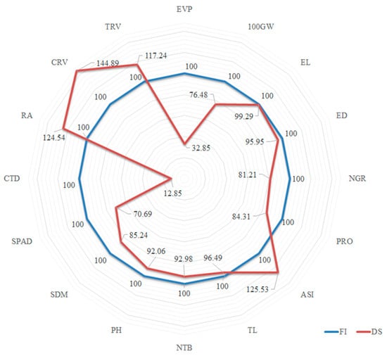 Under DS, the agricultural traits of the first order 100GW, NGR and PRO were considerably decreased, with lower mean estimates (23.52%, 18.79% and 15.69%, respectively) (Figure 3) than under FI. The marked reductions caused by water deficiency in the DS condition were also observed in the physiological traits (second chain), in particular for SDM (14.75%) and SPAD (29.31%) (Figure 3). Under DS, the mean CTD value increased in the order of 87.15%, in relation to the FI condition (Figure 3). This shows that under DS, the atmospheric temperature is lower than or equal to that of the canopy. Compared to the control (FI), the means of the root traits RA, CRV and TRV were 24.53%, 44.89% and 17.24% higher, respectively, under DS (Figure 3).
