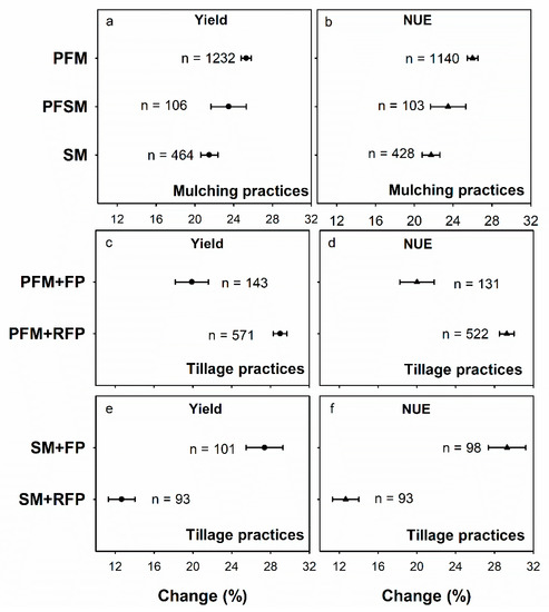 3.4. Yield and NUE of Potato in Response to Mulching with Different Tillage and Mulching Practices