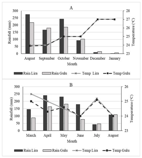 Total monthly rainfall and average air temperature for Lira and Gulu experimental locations; (A) second planting season 2017 and (B) First planting season 2018.