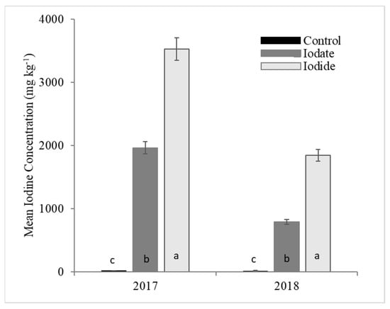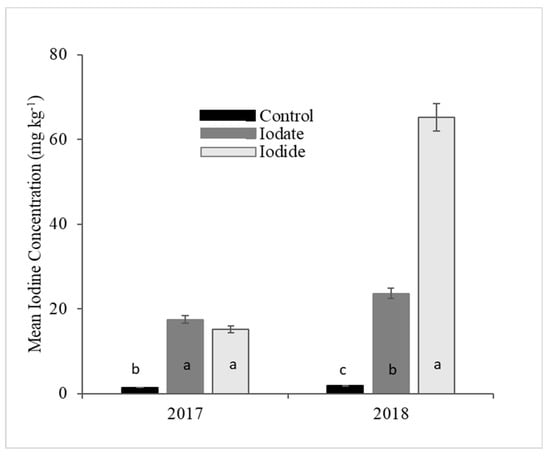 Mean iodine concentration of cabbage for control, iodate-, and iodide-treated plots in 2017 and 2018 (each year, n = 18) for the combined Gulu and Lira sites. Vertical columns within a year with different letters are statistically different at p < 0.05; Tukey’s HSD test.