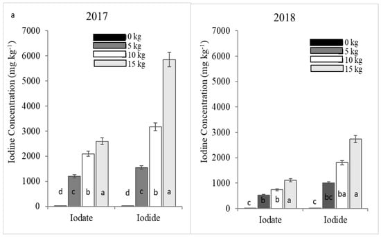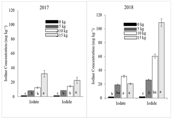 Mean iodine concentration of cabbage for different iodate and iodide fertilizer rates (kg I ha−1) in 2017 and 2018 (each year, n = 6) for the combined Gulu and Lira sites. Vertical columns within a year with different letters are statistically different at p < 0.05; Tukey’s HSD.