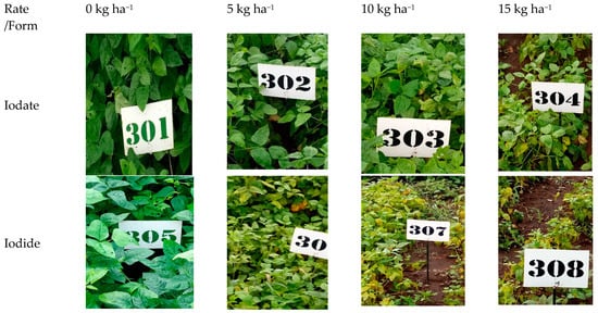 No phytotoxic effects (chlorosis, necrosis, and leaf defoliation) were observed when I was foliar sprayed on cabbage even at higher application rates. On the other hand, both iodate and iodide had phytotoxic effects on cowpea and these effects were more pronounced at higher application rates (Figure 6). At the same application rates, particularly 10 and 15 kg I ha-1, foliar application of I in iodide form resulted into more toxic effects (Figure 6: Plates 307 and 308) than when I was supplied in iodate form (Figure 6: Plates 303 and 304)