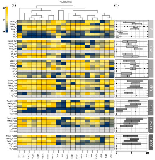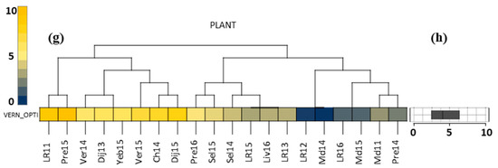 For the initialization of the simulations of water balance, two extreme scenarios were tested in all environments (i) WSC = WSC_MAX on 1 January before sowing without any previous crop (Kc limited to soil evaporation coefficient) and (ii) WSC = 0 at sowing. The two simulations converged rapidly and showed that the WSC was very close to 0 mm in August before sowing in almost all environments and was at field capacity in winter, as reported by Weymann et al. [29]. Then, WSC was initialized to 0 mm on August, 1st before each sowing. Based on the previous data, 15 descriptors were identified. Eight descriptors were based on direct calculations of the raw data (mean, range, and sum) and are summarized in Table 1a. They corresponded to the minimal temperature (TMIN), the maximal temperature (TMAX), the mean temperature (TMN) over a period and the length of a period in GDD (LGDD) for periods F, CW, B, and FLO. The water soil content maximal capacity (WSC_MAX) and the mean water soil content (WSC_MN). The sum of the radiations (SSR) and the photothermal quotient (QPT) only for the FLO period calculated as the ratio between SSR and LGDD [30,31]. Seven other descriptors consisted of the quantification of different stress durations by counting the number of days when the considered raw climatic data was under or above a given threshold. These descriptors are summarized in Table 1b and correspond to the number of days with Tmax > 25 °C (high temperature—HT), the number of days with 0 °C < Tmin < 5 °C (low temperature—LT), the number of days with Tmin < 0 °C (frost—FR). The number of days when WSC < 1/3 WSC_MAX (water stress—WS), the number of days when WSC = 0 mm (water deficiency—WD). The number of days with SR < 900 J cm−2 (lack of solar radiation—LSR) and the number of days with Tmean < 5 °C, and a day length below 9 h (optimal vernalization treatment [13]—VERN_OPT).