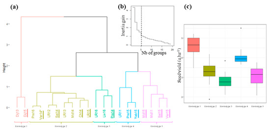 Based on the results of the PLS regression and of clustering of the environments, five envirotypes were identified regarding the inertia gain and the result of the Krzanowski and Lai index [40] (Figure 2a,b). The environments Dij13 and Dij15 constituted the envirotype 1. Pre16, Ver14, LR12, Sel14, LR13, Md14, Ch14, and LR15 constituted the envirotype 2. LR16, Liv16, and Pre14 constituted the envirotype 3. LR11, Pre15, and Yeb15 constituted the envirotype 4 and Md15, Md11, Sel15, and Ver15 constituted the envirotype 5. Noticeably, the different envirotypes did not correspond to a year or location specific classification except for the envirotype 1. The seed yield distribution of Aviso and Montego in each envirotype revealed high-yielding envirotypes (e.g., envirotype 1) and low-yielding envirotypes (e.g., envirotype 3) (Figure 2c).