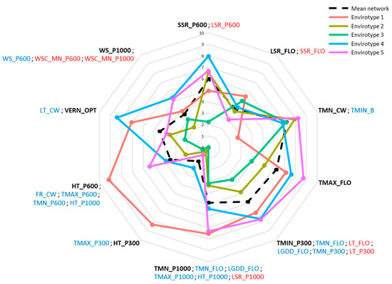 Characterization of the envirotypes using the 10 indicators selected by the PLS regression. The pedoclimatic indicators are written in black and the correlated indicators in blue (positive correlation) or in red (negative correlation). TMN_CW (mean temperature during the climatic winter period), TMAX_FLO (maximal temperature during the flowering period), TMIN_P300 (minimal temperature during the seed number fixation period), TMN_P1000 (mean temperature during the seed filling period), HT_P300 (number of days of high temperature during the seed number fixation period), HT_P600 (number of days of high temperature during the “allocation to the pod” period), VERN_OPT (number of days with an optimal vernalization treatment), WS_P1000 (number of days presenting a water stress during the seed filling period), LSR_FLO (number of days with a lack of solar radiation during the flowering period). The mean network is represented by a black dash line.