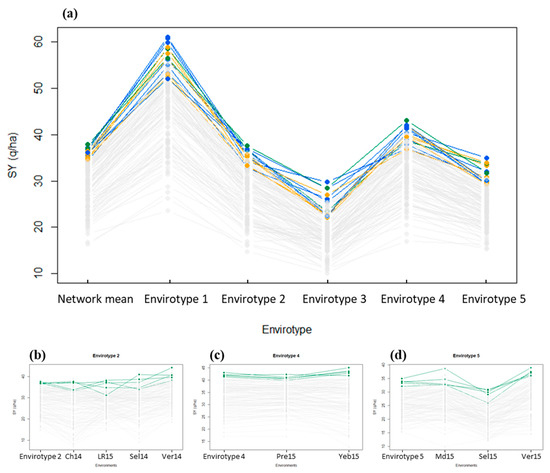 Ranking of the genotypes: (a) comparison of the top 5 genotypes in each envirotype across the whole network; network mean represented the mean ranking of the genotypes. Genotypes identified as one of the top 5 genotypes in three envirotypes are represented in green (●); the one identified in 2 envirotypes out of 5 are represented in blue (●) and the one identified in a single envirotype are represented in orange (●). (b,c,d) Ranking of the top 5 genotypes in green (●) for envirotype 2, 4, and 5, respectively, in each environment of the corresponding envirotype.