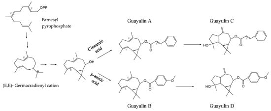 Guayulins A and B are thought to act as cinnamate and p-anisate reservoirs in guayule shrub, with metabolic turnover occurring at times when release of the free acids into the cellular environment is required [28]. They belong to the family of bicyclogermacrenes, while guayulins C and D would belong to the family of aromadendranes. Other sesquiterpenes found in guayule, apart from guayulins, that have shown biological activity are eudesmol (eudesmane), partheniol (bicyclogermacrene), and guayulone (their structures are shown in Table 1).