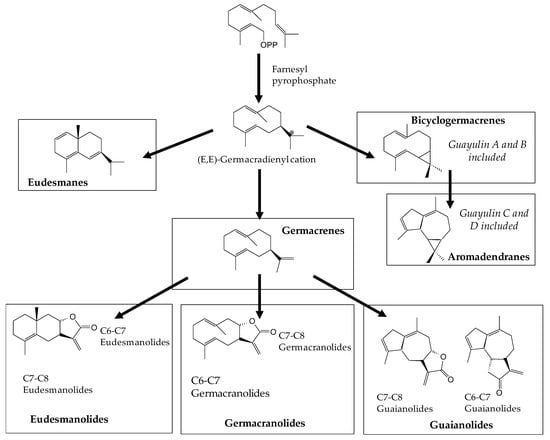 Sesquiterpenes are C-15 terpenoids which occur as hydrocarbons or in oxygenated forms such as alcohols, ketones, aldehydes, acids or lactones in nature. All sesquiterpenes share in common a C15 backbone derived from the linear precursor FPP (farnesyl pyrophosphate), which is typically cyclized by class I terpene synthases known as sesquiterpene synthases [23,24,25]. Structural relationships among other members of the same biosynthetic route are shown in Figure 2, where we have gathered knowledge from pyrethrum [26] and maize [27], among many others, and related their relationships to the guayulins.