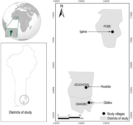 The study was carried out in three villages of southern Benin with different sociolinguistic groups where the three species were reported [30]. We considered sociolinguistic group as ‘’a group in which a member inherits a common language of communication and shares social attributes such as customs, history, and food habits’’ [9]. Villages included Adjohoun, Dangbo, and Pobè (Figure 1). The district of Adjohoun is located in the Department of Ouémé, 32 km north of Porto-Novo. Its total area is nearly 308 km2. Its population is about 74,956 inhabitants [31]. It is composed of 48% men and about 52% women. Adjohoun is mainly rural and more than 80% of the active population is employed in agriculture. The district is mainly populated by the Wémè sociolinguistic group and to a lesser extent by Goun and Yoruba. The district of Dangbo is also located in the Department of Ouémé and covers about 149 km2 with a population size of about 95,908 [31], of which 49% are men and 51% are women. The main sociolinguistic group is Aïzo. The third district is Pobè, located in the Department of Plateau. It covers about 400 km2. The population of Pobè is around 123,740 inhabitants and composed of 48% men and 52% women. The main sociolinguistic groups is Holly with a minority of Nagot people [32]. All three sociolinguistic groups belong to the ‘Kwa’ linguistic categories. However, Aïzo and Wémè belong to the ‘gbe’ subcategory dominated by the Fon/Adja group, while Holly belongs to the ‘ede’ subcategory dominated by the Yoruba linguistic group [32]. There are differences among sociolinguistic groups and these are related to customs and beliefs, traditional religions, and practices. Communities sharing the same cultural background are likely to have convergent patterns of plant knowledge and use [33], with the exceptions that people of the same sociocultural background living in contrasting phytogeographical areas may also have different plant knowledge [9].