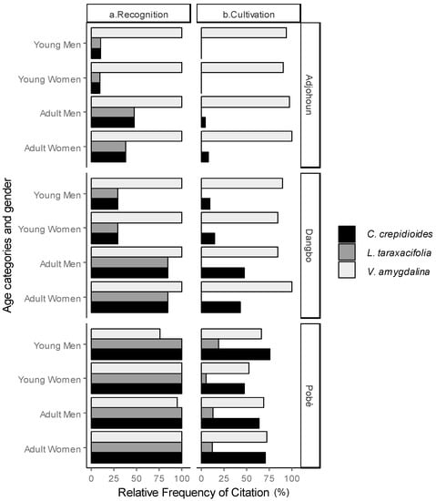 Our results suggested a differential pattern in the recognition and cultivation of the three leafy vegetables across villages, generation, and gender, as the studied vegetables were more recognized in Pobè than in Dangbo and Adjohoun. This differential pattern could be due to the natural distribution of the species and food habits (the species may occur without being used). All three species were reported in the flora of Benin [30] to occur in the study areas (phytodisctricts of Pobè and Ouèmé). Vernonia amygdalina, the most popular vegetable, has historically been used in all parts of the country [9]. It is also cultivated in home gardens and in urban and peri-urban agriculture. The availability hypothesis, according to which, plants are used because they are more accessible or locally abundant [16,38], may explain this pattern of recognition. Vernonia amygdalina as a widely distributed and cultivated vegetable [30], was more familiar to local farmers compared to the other two species. Crassocephalum crepidioides was cultivated by only adults at Adjohoun and Dangbo. Launaea taraxacifolia was cultivated only in Pobè by all categories of informants. A higher proportion of older informants cultivated L. taraxacifolia and C. crepidioides in Dangbo and Adjohoun, while neither age-specific nor gender-specific patterns were observed in Pobè. That finding suggested that older informants had more knowledge on the propagation of L. taraxacifolia and C. crepidioides in Dangbo and Adjohoun, while in Pobè younger and older informants, irrespective of their gender, held similar knowledge on all species.