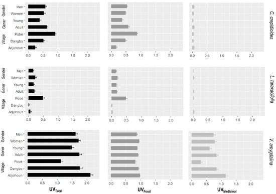 The total use value of L. taraxacifolia differed only among villages, with Pobè having the highest value (0.48 ± 0.05 against 0.06 ± 0.03 for Adjohoun and 0.01 ± 0.01 for Dangbo) (Figure 3, Table 3). A similar trend was noticed for the food use value. The medicinal use value, however, was similar between a child and parent, and men and women, though women had a relatively higher use value (0.22 ± 0.04 for women against 0.15 ± 0.03 for men). The medicinal use value was similar between gender, generation, and villages (p > 0.05). Overall, the food use value of L. taraxacifolia also outweighed the medicinal use value (>89% of the species total use value) although the latter exhibited more cited specific uses (Table 4).