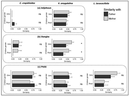 Results from the analysis of the knowledge similarity between boys or girls and the two parents (mother and father) based on Jaccard similarity coefficients showed that for C. crepidioides and L. taraxacifolia, no significant difference (p > 0.05, Figure 4) was detected between the children and the parents’ knowledge in any village. For those two leafy vegetables, the knowledge transmitted by mothers was similar to the one transmitted by fathers. Likewise, child knowledge similarity with that of parents did not differ significantly between girls and boys (p = 0.685 for C. crepidioides, p = 0.426 for L. taraxacifolia) indicating a similar level of knowledge transmission to boys and girls. Differences were only observed among villages. For C. crepidioides, child knowledge similarity with that of parents was at least five times higher in Pobè (Jaccard similarity = 0.74 ± 0.05) than in the other villages (p < 0.01). There was practically no knowledge of L. taraxacifolia in Adjohoun and Dangbo and no exchange between children and parents. However, a significant difference was observed between boys and girls whose knowledge of L. taraxacifolia was more similar to that of the parents (0.64 ± 0.09); boys and parents’ knowledge similarity was comparatively lower (Jaccard similarity = 0.31 ± 0.09, Figure 4).