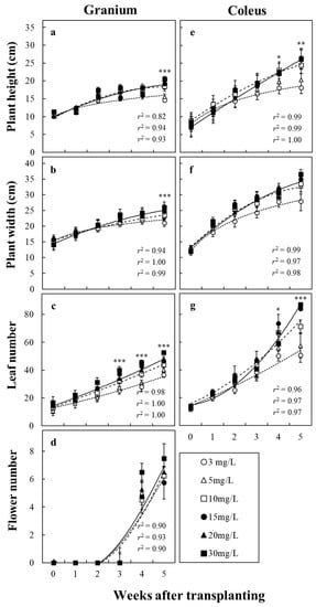 The growth of plants was closely monitored during their production period. Plants were harvested at two different times, i.e., 3 weeks (vegetative phase) and 5 weeks (reproductive phase). Growth parameters including plant height (measured from the pot rim to the top of the tallest leaf), plant width (averaged from two perpendicular measurements), branch number (longer than 5 cm), and leaf number (longer than 3 cm) were measured weekly. For geranium plants, the number of inflorescences was counted from the third week after transplanting when each floret started to bloom. The number of open florets in each inflorescence was also counted. At the time of harvest, all growth parameters were recorded again. Inflorescence diameter was measured from two perpendicular measurements and averaged. Individual leaves longer than 3 cm were removed to measure leaf area with a LI-3100 Area Meter (Lincoln, NE, USA). Leave, stems, roots, and inflorescences were separately harvested and dried in an oven set at 75 °C until the samples were completely dry to weigh the dry mass. For coleus plants, data were recorded similarly as described above. Since coleus flowers formed on the terminal spiked stalks, it was not possible to separate flower spikes from the stems. Therefore, leaves and stems including flower spikes were separated from the roots and dried in an oven for dry mass measurements.