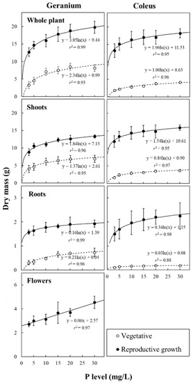 The effects of P level on dry biomass accumulation of geranium and coleus plants. Each symbol is the mean of 6 replicates ± SE. Solid lines indicate logarithmic fits to the respective data (p < 0.05). The regression lines were fitted through the data during the vegetative phase as shown in dashed line; and during the reproductive phase in solid line.
