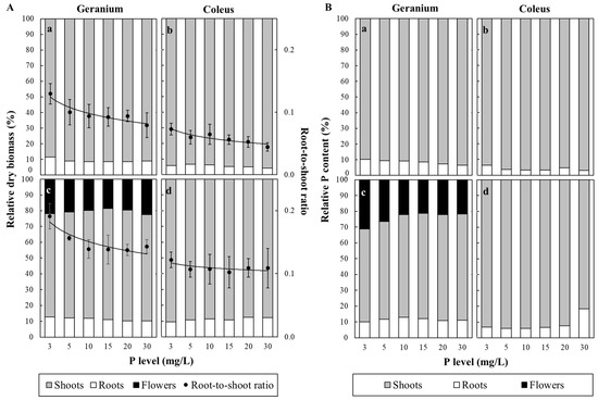 The effects of P level on (A) dry mass allocation (%) and (B) relative P content (%) of shoots, roots, and flowers in geranium and coleus plants during the vegetative (a,b) and reproductive (c,d) phases.