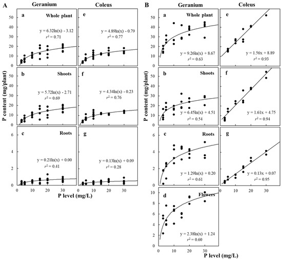 The effects of P level on P content in whole plant (a,e), shoots (b,f), roots (c,g), and flowers (d) of geranium and coleus plants during the vegetative (A) and reproductive (B) phases. Solid lines indicate logarithmic or linear fits to the respective data (p < 0.05).