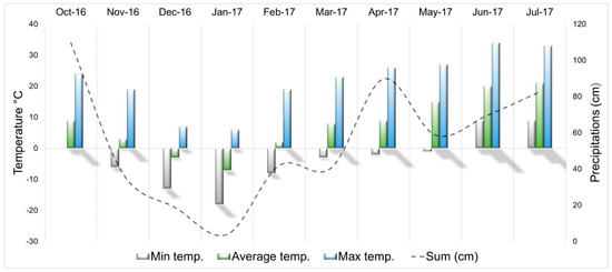 Climatic data for interval between October 2016–July 2017, corresponding to interval between planting and rhizome harvesting can be seen in Figure 1. During overwintering of the plants in field, temperatures reached as low as −18 °C in January and as high as 34 °C in July at the end of the experiment. Highest precipitation levels in descending order, were registered during months of October—prior and during planting—and in April when plants were in leaf elongation phenophase. Water availability at the time of planting ensured rooting of plants in autumn before winter dormancy and favorable growth conditions were met again in spring at when plants entered in vegetation.