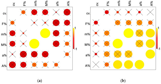 Correlograms for colonization parameters in two sets of Iris germanica plants: (a) non-inoculated (AM–) and (b) AM inoculated (AM+) after 8 months in field, where: cv—cultivar gradient, F%—AM frequency, m%—AM intensity in root fragments, M%—AM intensity in root system, a%—arbuscules abundance in mycorrhizal parts of root fragments, A%—arbuscules abundance in root system; yellow indicates positive correlation, dark red negative correlation, p > 0.05 crossed.