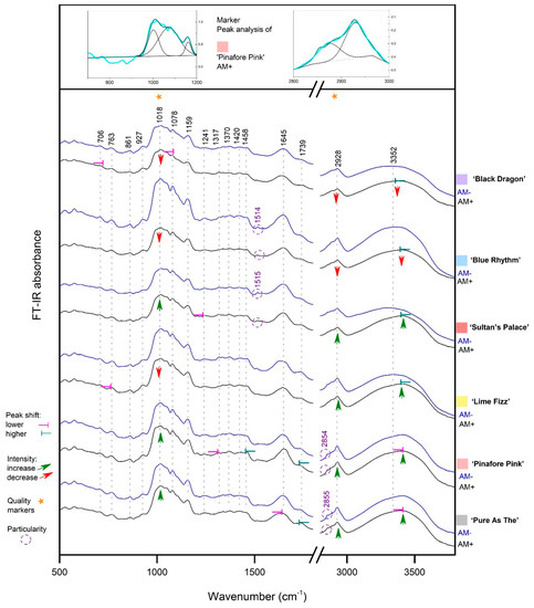 FT-IR spectra for rhizomes belonging to 12 experimental variants can be seen in Figure 4. These spectra correspond to rhizomes from Iris germanica plants, which benefited from application of the commercial products with AM (AM+) and control plants (AM–) of six cultivars. Changes that occurred for spectra refer to two types of characteristics: first, variations in peak position and secondly in peak intensity. These spectra features have been used before in FT-IR screening of rhizome samples belonging to Zingiberaceae species [36]. Shift in peak position refers to a displacement or change in peak wavenumber on FT-IR spectra for inoculated compared to non-inoculated plants of each cultivar, with a condition that the difference in positioning at either higher or lower wavenumber should be of at least 4 wavenumber units (cm−1) and are marked on peak with a small pink or blue line (Figure 4). Increase or decrease in intensity is indicated by small arrows beneath bands screened for changes (Figure 4). In text when peak intensity changes are mentioned between non-inoculated versus inoculated plants, the values are provided, which represent how much the absorbance changed. Model peak analysis for two ranges proposed as marker bands for Iris germanica rhizome are detailed at the top of Figure 4, showing that contribution is given by different functional groups due to complex composition of rhizomes. List of peak readings for all 12 variants is provided in Supplementary Table S1.