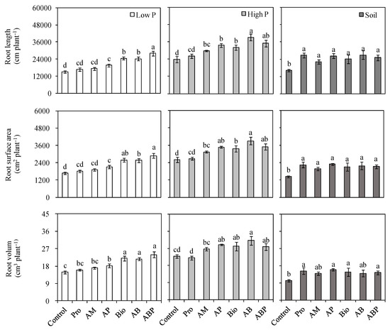 Root length, surface, and volume of different treatments under two phosphorus conditions. Low P and High P mean low and high phosphorus conditions, respectively. Different letters mean significant differences (p ≤ 0.05) among different treatments after ANOVA and LSD tests. The bars represent means ± SE (n = 7). Control, untreated; Pro (Pseudomonas sp. strain DSMZ 13134); AM (AM fungi); AP (AM fungi + Pseudomonas sp. AP); Bio (biochar); AB (AM fungi + biochar); ABP (AM fungi + biochar + Pseudomonas sp.). High P is fertilized with 60 mg L−1 phosphorus, low P is 30 mg L−1.