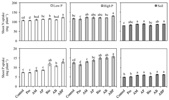 Shoot N and P uptake of different treatments under two phosphorus conditions. Low P and High P mean low and high phosphorus conditions, respectively. Different letters mean significant differences (p ≤ 0.05) among different treatments after ANOVA and LSD tests. Bars represent means ± SE (n = 7). Control, untreated; Pro (Pseudomonas sp. strain DSMZ 13134); AM (AM fungi); AP (AM fungi + Pseudomonas sp. AP); Bio (biochar); AB (AM fungi + biochar); ABP (AM fungi + biochar + Pseudomonas sp.). High P is fertilized with 60 mg L−1 phosphorus, and low P with 30 mg L−1.