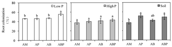 The root colonization rates of AM fungi were analysed for all treatments, including control plants which without inoculation and no colonization. The colonization rate of mycorrhizal plants reduced with a high P level compared with those at a low P level (Figure 4). Under the low P condition, root colonization was significantly induced by the interactions combining all three aspects of AM fungi, Pseudomonas sp., and biochar (ABP treatment) with a 19.8% increase compared with AM alone; however, all treatments showed no difference under the high P condition (Figure 4). Under the soil condition, the colonization rates of treatment of AP and ABP were influenced compared with AM fungi treated alone (Figure 4).