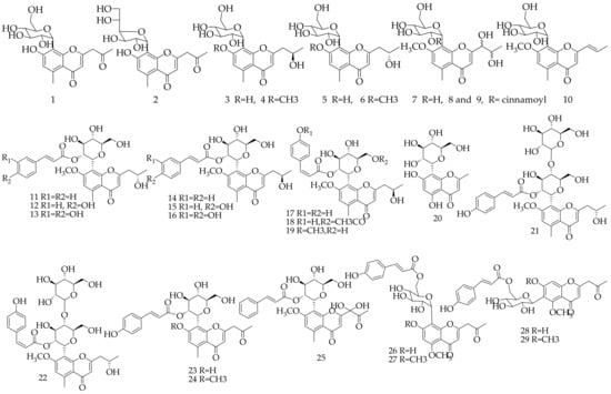 - Hutter, J.A.; Salman, M.; Stavinoha, W.B.; Satsangi, N.; Williams, R.F.; Streeper, R.T.; Weintraub, S.T. Antiinflammatory C-Glucosyl Chromone from Aloe barbadensis. J. Nat. Prod. 1996, 59, 541–543. [Google Scholar] [CrossRef]