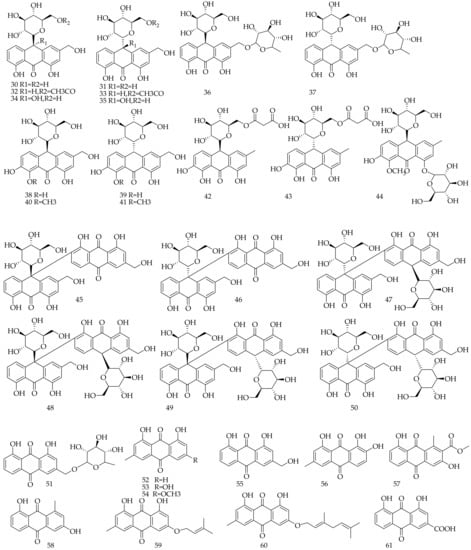 Approximately 32 anthraquinones and their glycoside derivatives were isolated and identified from Aloe vera (Table 2, Figure 2). The isomers of aloin A (30) and aloin B (31), two anthraquinone glucosides, are the most abundant active constituents of Aloe vera. However, chrysophanol (52), emodin (53), physcione (54), aloe-emodin (55) are four major anthraquinone aglycones. Six anthraquinone dimmers (45–50) were also identified from Aloe vera.
