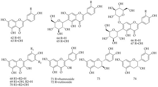 Approximately 13 flavonoids and their glycoside derivatives were isolated and identified from Aloe vera (Table 3, Figure 3), including three types; namely flavone (62–67), flavonol (68–72), and flavan-3-ol (73,74).