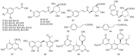 Approximately 12 phenylpropanoid acids and their ester derivatives (75–86), and four coumarins (87–90), were isolated and identified from Aloe vera (Table 4, Figure 4).