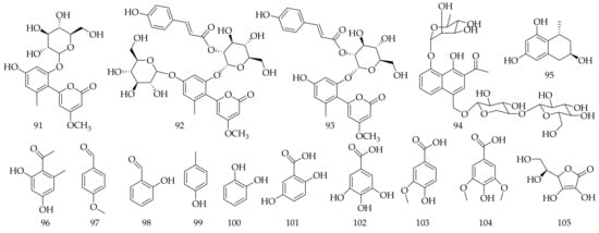 Approximately three phenylpyrone derivatives (91–93), one triglucosylated naphthalene derivative named aloveroside A (94), and one 1-methyltetralin derivative feroxidin (95) were isolated and identified from Aloe vera (Table 5, Figure 5). Nine phenol derivatives (96–104) and vitamin C (105) were also isolated from Aloe vera.