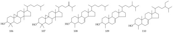 Five phytosterols (Table 6, Figure 6) were isolated from Aloe vera gel, including cycloartanol (106), 24-methylene-cycloartanol (107), lophenol (108), 24-methyl-lophenol (109), and 24-ethyl-lophenol (110) [45]. Some polar and nonpolar lipids, as well as prostanoids, were also isolated from Aloe vera leaves [46]. Chemical investigation of the major constituents in Aloe vera leaves revealed moisture, ash, fiber, protein, lipids, minerals, organic acids, free sugars, and polysaccharides. Glucose, fructose, and sucrose were the main free sugars. Oxalic, L-Malic, isocitric, lactic, acetic, isocitric, lactone, citric, and fumaric acid were the main organic acids.