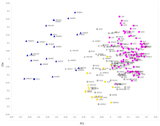 Usually, the domestication area of cultivated plants might be inferred from the distribution of their wild progenitors [11]. To date, the true wild progenitor of broomcorn millet is still uncertain. Weedy broomcorn millet (Panicum ruderale (Kitag.) Chang comb. Nov.), the companion weed of cultivated broomcorn millet, is the only species in Panicum exhibiting a widespread distribution across a region spanning from northern China to western Eurasia and can produce fertile offspring by crossing with cultivated broomcorn millet. The weedy broomcorn millet is considered possibly to be the descendant of the wild ancestor or a feral type of this cereal [2,12]. SSR markers have been successfully used to study the genetic diversity of broomcorn millet in several studies [10,11,13,14,15]. However, the study of domestication by comparing the genetic diversity between cultivated broomcorn millet and its weedy forms using SSR markers is still lacking and the explicit domestication areas of the broomcorn millet are still unclear. In our study, the evolutionary and genetic relationships between the weedy and cultivated broomcorn millets are studied using the simple sequence repeats (SSR) markers, also known as microsatellites. Specifically, three questions were addressed: (1) Is weedy broomcorn millet the descendant of the wild ancestor of the cultivated broomcorn millet? (2) Where is the explicit domestication area of cultivated broomcorn millet in China? (3) Where are the spread routes of this cereal after being domesticated in China? Our results support our hypotheses that (1) the weedy populations in China may harbor the ancestral variations that gave rise to the domesticated broomcorn millet; (2) there may be at least two independent domestication areas of broomcorn millet in China—the cultivars domesticated in the Loess Plateau, while the cultivars domesticated in the Northeast China; and (3) the westward spread routes of broomcorn millets that we speculated in this study coincide exactly with the prehistoric Oasis Route and Steppe Route, respectively.