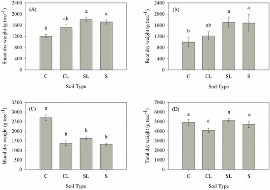 Irrigation water and soil analyses indicated no chemical limitations to plant growth [23]. Total plant dry weight at the end of the experiment did not significantly differ among soil types. However, shoot and root dry weights were significantly higher in the SL and S soils compared to the C soil. Trees in the C soil had significantly greater wood dry weight than trees in the SL or S soils (Figure 1). Dry matter partitioning within trees was similar among CL, SL and S soils. However, trees in the C soil had more dry matter partitioned to the wood than the roots or shoots (Figure 2).