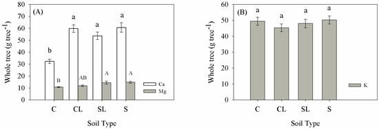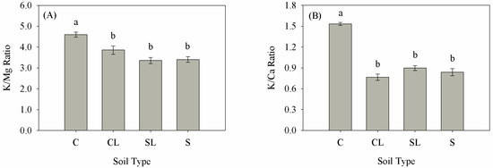 The Ca content (absolute quantity, g) in the roots, shoots, and whole tree were significantly lower in the C soil than in the SL or S soils (Figure 3). The K content in the shoots of plants grown in C soil were significantly lower than that of plants in CL, SL or S soils (Table 2). The K/Ca ratio in the CL, SL and S soils ranged from 0.8 to 0.9, with no significant differences in K/Ca among those three soil types. However, the K/Ca ratio was significantly higher in trees in the C soil than in the other soil types (Figure 4).