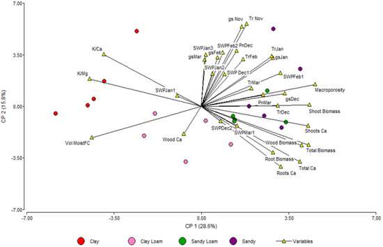Principal Component Analysis of clay (C), clay loam (CL), sandy loam (SL), and sandy (S) soils. The variables that were grouped by soil type were: volumetric soil moisture at field capacity (Vol MoistFC), macroporosity, total Ca content in the plant (Total Ca), Ca content in the wood (Wood Ca); Ca content in the shoots (Shoot Ca); Ca content in the roots (Root Ca); plant K/Ca ratio, plant K/Mg ratio, total plant biomass, wood biomass, shoot biomass, root biomass, transpiration (Tr, from November to March); stomatal conductance (gs, from November to March), stem water potential (SWP, from December to March), net CO2 assimilation (Pn, from December and March). Circles correspond to soil observations (red for C, pink for CL, green for SL and violet for S) and yellow triangles represent the measured variables.