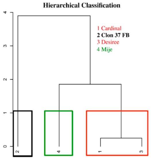 Hierarchical classification using water stress indices separated the genotypes into three groups. The first group included Clone 37 FB, which was less affected in the yield stability index (YSI); and the second group included Mije, which was less affected in mean productivity (MP), geometric mean productivity (GMP), and drought tolerance index (DTI). Finally, a third group included the Desirée and Cardinal clones that had more similar yield-based indices (Figure 2).